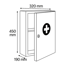 Medicine cabinet with single door opening. Internal shelves. Possibility of wall mounting. Key lock.